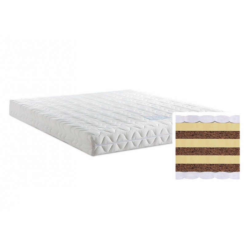 В качестве наполнителя матраса используется экологически чистый наполнитель - латекс. Материал изготавливается посредством вспенивания сока дерева гевеи. Эластичный наполнитель имеет структуру в виде ячеек. За счет этого обеспечивается воздухопроницаемость, создается необходимый микроклимат и регулируется влажность и температура матраса. Эластичность латекса позволяет обеспечить правильное положение позвоночника. В качестве наполнителя матраса используется натуральная кокосовая койра. Волокна из орехов кокоса скреплены с помощью латекса. 100% природный материал имеет бактерицидные, гапоаллергенные и антибактериальные свойства. Вентиляционные качества койры способствуют циркуляции воздуха. Ортопедический эффект образуется за счет высокой степени жесткости материала. Спанбонд - это нетканое синтетическое гигроскопичное полотно, которое имеет высокую плотность и выполняет защиту внутреннего наполнения матраса от воздействия пружинного блока. Оно гарантирует дополнительную прочность матраса. Он отвечает за равномерное распределение нагрузки между слоями наполнения.