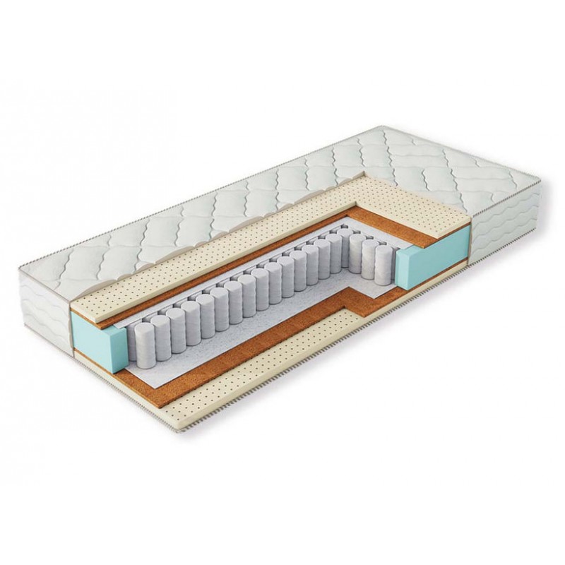 В изделии используется натуральная кокосовая койра. Волокна из орехов кокоса скреплены с помощью латекса. 100% природный материал имеет бактерицидные, гипоаллергенные и антибактериальные свойства. Вентиляционные качества койры способствуют циркуляции воздуха. Ортопедический эффект образуется за счет высокой степени жесткости материала. В качестве наполнителя матраса используется экологически чистый наполнитель - латекс. Материал изготавливается посредством вспенивания сока дерева гевеи. Эластичный наполнитель имеет структуру в виде ячеек. За счет этого обеспечивается воздухопроницаемость, создается необходимый микроклимат и регулируется влажность и температура матраса. Эластичность латекса позволяет обеспечить правильное положение позвоночника. Еврокаркас располагается строго по периметру внутри матраса, создавая правильную форму боковой части. Выполнен он из пенополиуретана - синтетического упругого материала. Каркас дополнительно повышает жесткость и упругость краев и защищает его от проседания и деформации. Матрас оснащен аэраторами, которые представляют собой специальные вентиляционные отверстия. Аэраторы способствуют циркуляции воздуха непосредственно внутри матраса. Благодаря этому на накапливается влага, предотвращается возникновение пыли и развитие микроорганизмов.
